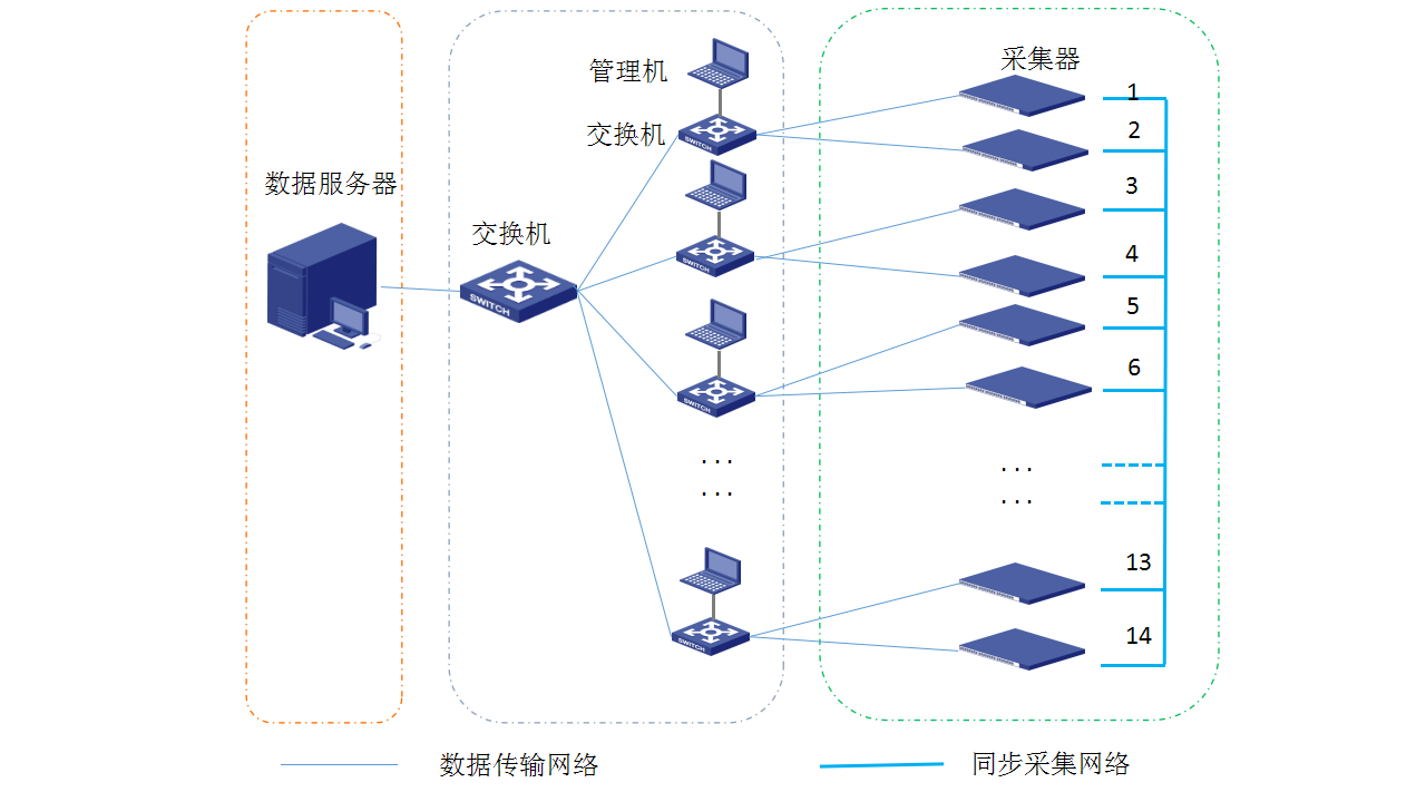 NET2991數據采集器為多通道高速同步數據采集方案,能實現模擬(16路)和數字信號(16路)的同步采集,連續采集和有限采集的模式,數字和軟件觸發雙重模式,可實現多器級聯工作,數據遠端集中控制。客戶共使用十四個NET2895數據采集器,實現224路信號同步采集,根據數據交換機、服務器等級不同,理論上可實現上千路信號的高速同步采集,滿足高密度、多地點、高采樣、全同步的采集需求。