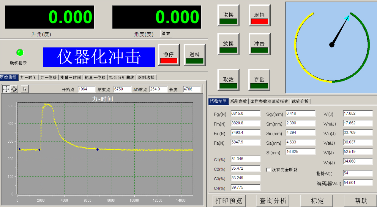 3、根據力傳感器測量值計算屈服力、大力、不穩定裂紋擴展起始力、不穩定裂紋擴展終止力四個力;屈服位移、大力時位移、不穩定裂紋擴展起始位移、不穩定裂紋擴展終止位移、總位移五個位移;大力時能量、不穩定裂紋擴展起始能量、不穩定裂紋擴展終止能量、總能量等六個能量;C1、C2、C3、C4四個韌性斷面率等19個結果。