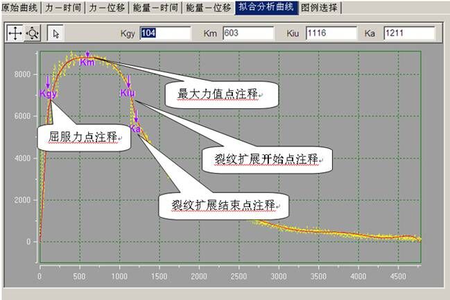 3. 13個性能參數中有4個力、5個位移、4個能量參數。它們分別表示出材料受沖擊后的彈性、塑性和斷裂過程的性能指標,這是沖擊試驗質變的標志;
