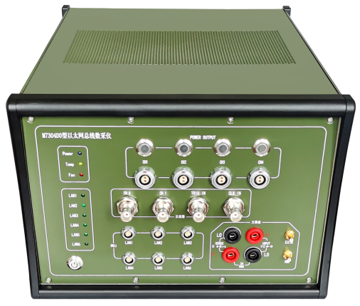 M7304D0以太網總線數采儀設備選用飛騰/FT2000-4處理器、操作系統為銀河麒麟。設備集成高速數字化儀示波器、數字化萬用表、4路帶獨立控制的電源輸出接口、8路以太網交換機。該設備具有國產化率高、處理能力強、功耗低、維護方便等特點。